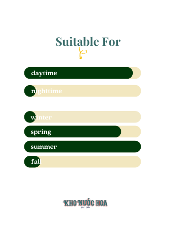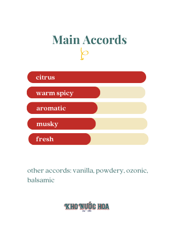 Hương đầu: Chanh vàng, gừng, elemi, quả táo Hương giữa: Ozonic, quảng hoắc hương, hoa hồng Hương cuối: Xạ hương, vanilla, rêu.