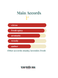 Hương đầu: Bưởi, Cam quýt Hương giữa: Hạt tiêu, Phong lữ, Hoa oải hương, elemi Hương cuối: Ambroxan, woody notes, cỏ hương bài, cây tuyết tùng