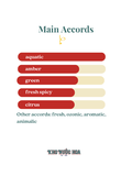 Hương đầu: Bưởi, bạc hà, gừng, tiêu hồng Hương giữa: Note nước, lá tím, hương gỗ Hương cuối: Long diên hương, hổ phách, gỗ guaiac, cây tuyết tùng