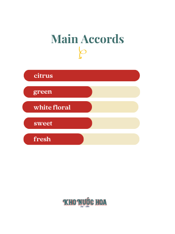 Hương đầu: Quýt Ý, quả cam, chanh vàng Hương giữa: Hoa cam Tunisia, lá sung, húng quế Hương cuối: Xạ hương, gỗ tuyết tùng Virginia, tinh dầu cỏ hương bài Java
