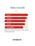 Hương chủ đạo: Thuốc lá, mật ong, hoắc hương, benzoin, cúc trường sinh, dầu cypriol/ Nagarmotha, woodsy notes