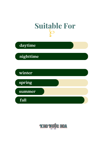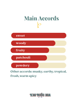 Hương đầu: Vải, quả lê, kiwi Hương giữa: Socola trắng, bánh nướng, hoa nhài, phong lan Hương cuối: Hoắc hương, hương gỗ, xạ hương, rễ diên vỹ