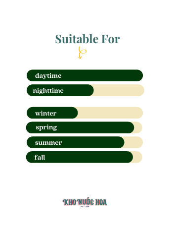 Hương cuối: Hương Coumarin, Hoa vòi voi, Gỗ đàn hương, Hương Vanilla, Rêu sồi Moss, Xạ hương trắng