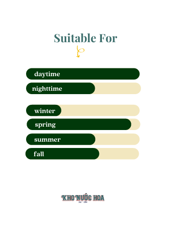 Hương cuối: Hoắc hương, Xạ hương, Cỏ hương bài, Vanilla.