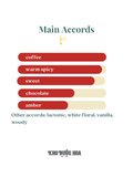 Hương đầu: Cà phê Hương giữa: Sữa đặc, socola đen, hoa linh lan Hương cuối: Đậu tonka, gỗ tuyết tùng, hổ phách