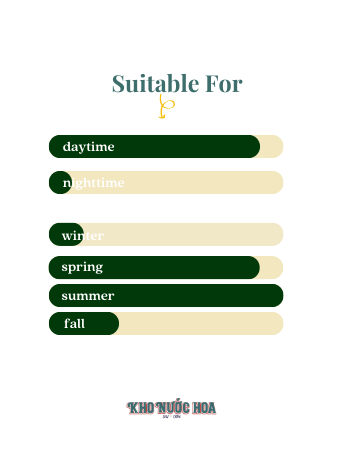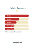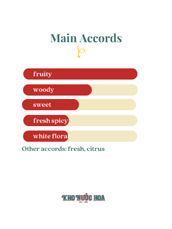Hương đầu: Quả táo, bưởi hồng Hương giữa: Mâm xôi, lựu, hoa nhài, hoa diên vỹ Hương cuối: Gỗ tuyết tùng, da thú