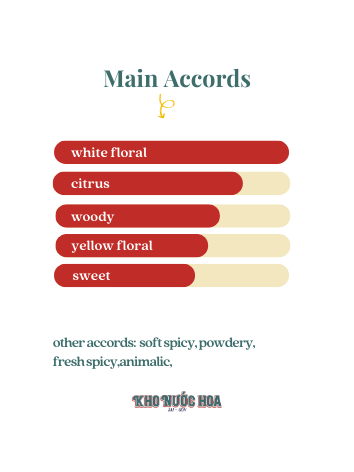 Mở đầu bằng cam bergamot lấp lánh đóng vai trò như một điểm đối lập đầy tươi sáng với những bông hoa trắng ở tầng hương giữa. Hoa lily Casablanca, ylang và hoa cam đan xen vào nhau tạo ra một bó hoa trắng mềm mại, ngọt ngào ngát hương thơm. Hương hoa tươi mát kéo dài rồi để lại trên da một vệt gỗ ấm áp ngọt ngào của đàn hương, vanilla và hổ phách.