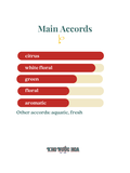 Hương đầu: Bưởi, canh vàng, hương nước Hương giữa: Hoa trắng, hoa dành dành, hương xanh, hoa đậu ngọt Hương cuối: Xạ hương, hương gỗ