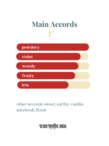 Hương đầu: Dâu rừng, violet Hương giữa: Mống mắt, quảng hoắc hương Hương cuối: Cây tuyết tùng, vanilla.