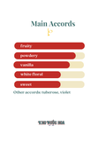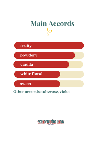 Hương đầu: Quả đào Hương giữa: Hoa huệ, hoa nhài, violet Hương cuối: Vanilla, xạ hương, gỗ đàn hương