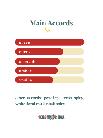 Hương đầu: Cam bergamot, lá xanh, galbanum Hương giữa: Rau mùi, hoa nhài Hương cuối: Hổ phách, vanilla, xạ hương
