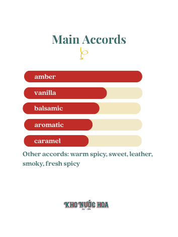 Hương chủ đạo: Hổ phách, caramel, elemi, vanilla, an tức hương, da thuộc, đậu tonka, nhang, hạt tiêu, gỗ tuyết tùng