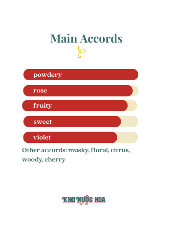 Hương giữa: Cherry, hoa hồng Nhật Bản (Hamanasu), hoa diên vĩ, quả mâm xôi, hoa hồng, hedione, đào, lý chua đen