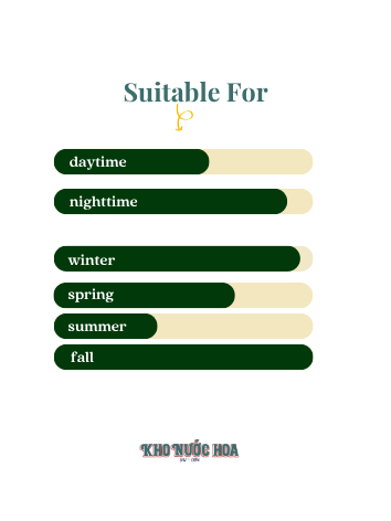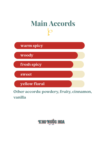 Hương đầu: Đào, hoa ngọc lan tây Hương giữa: Gỗ đàn hương Hương cuối: Quế, nhục đậu khấu, vanilla, ớt, quả thì là