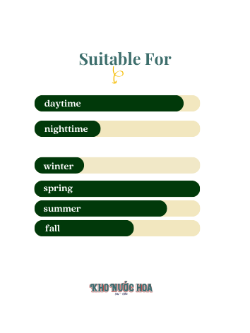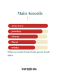 Hương đầu: Hoa cam neroli, cam bergamot Hương giữa: Hoa bông gòn, hoa cam, hoa nhài, hoa linh lan Hương cuối: Xạ hương, benzoin