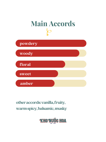 Hương đầu: Quả mơ, quả goji Hương giữa: Hoa hạnh nhân, hoa nhài, hoa neroli Hương cuối: Gỗ đàn hương, Vanilla, Xạ hương, Myrrh, iris, gỗ tuyết tùng