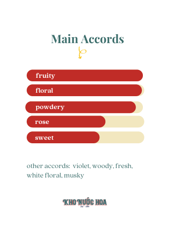 Hương đầu: Quả đào, quả mơ, lan Nam Phi, nho đen Hương giữa: Hoa hồng, violet, cây bông súng, hoa lily, ylang-ylang Hương cơ bản: Xạ hương, vanilla, gỗ đàn hương.