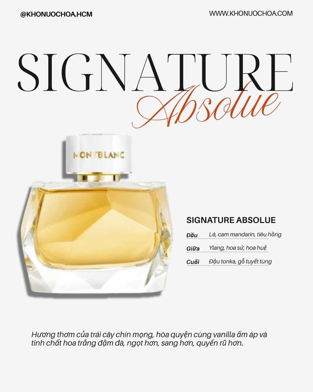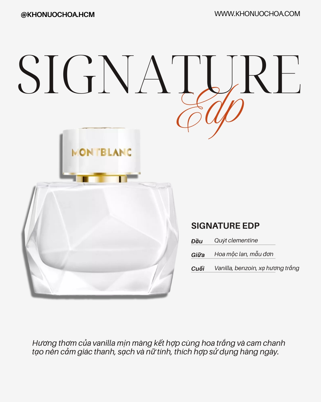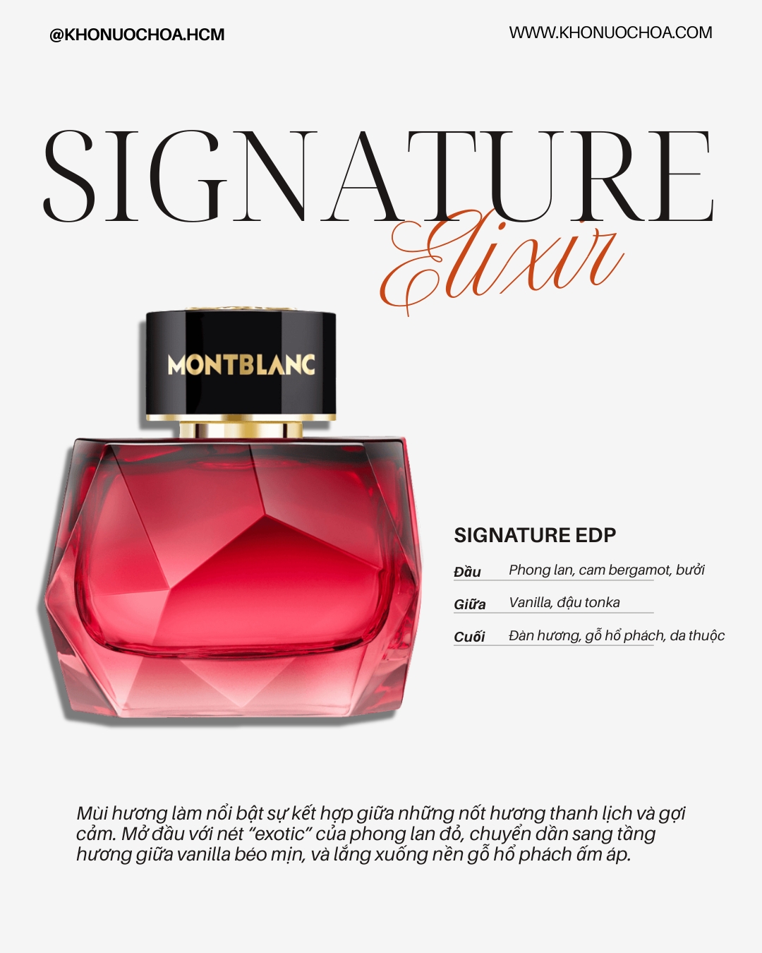 Sau sự ra mắt thành công của chai nước hoa Signature EDP, M0ntblanc đã nhanh chóng bổ sung thêm 2 phiên bản flanker là Signature Absolue (2023) và Signature Elixir (2025).